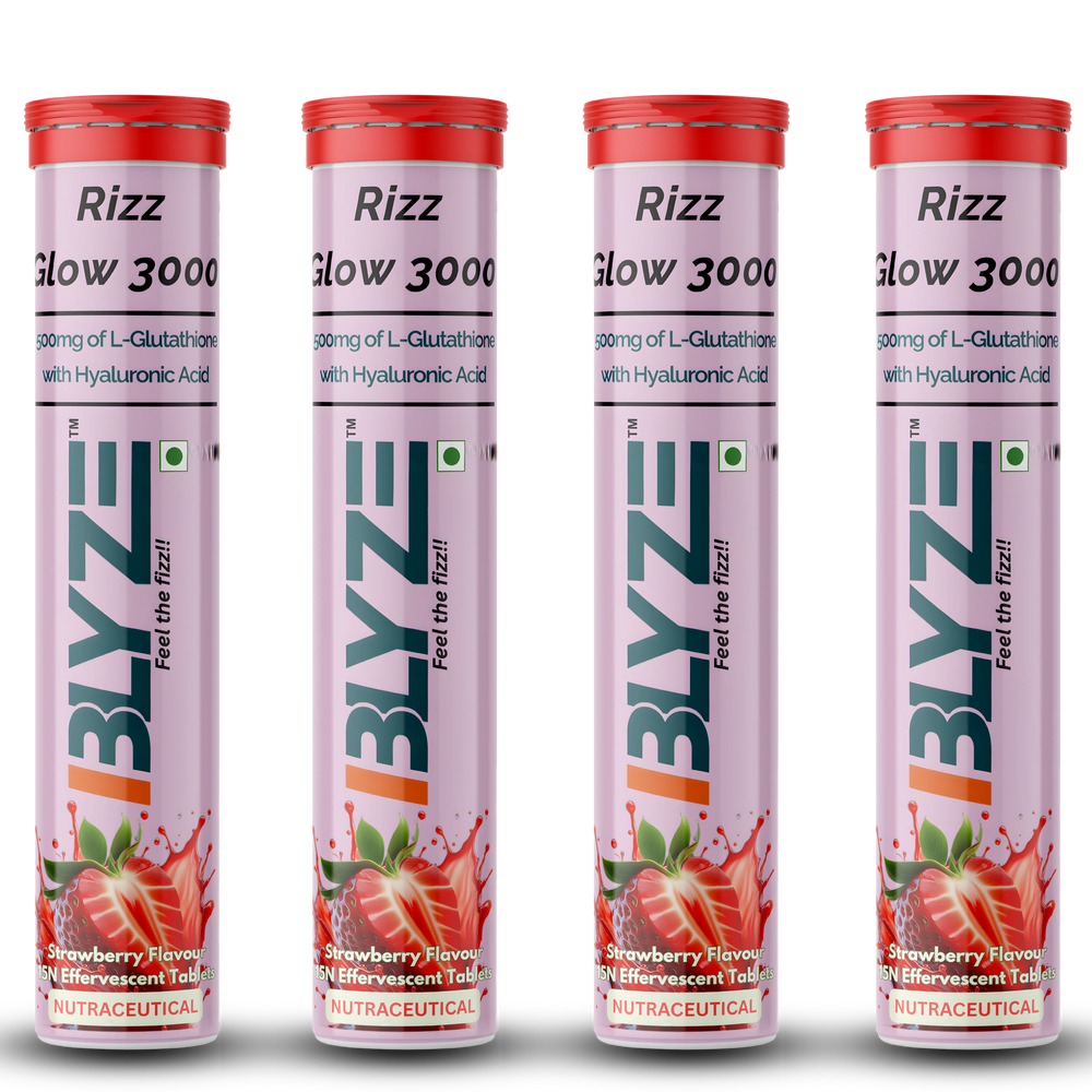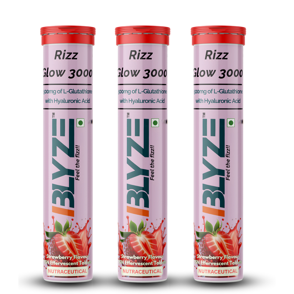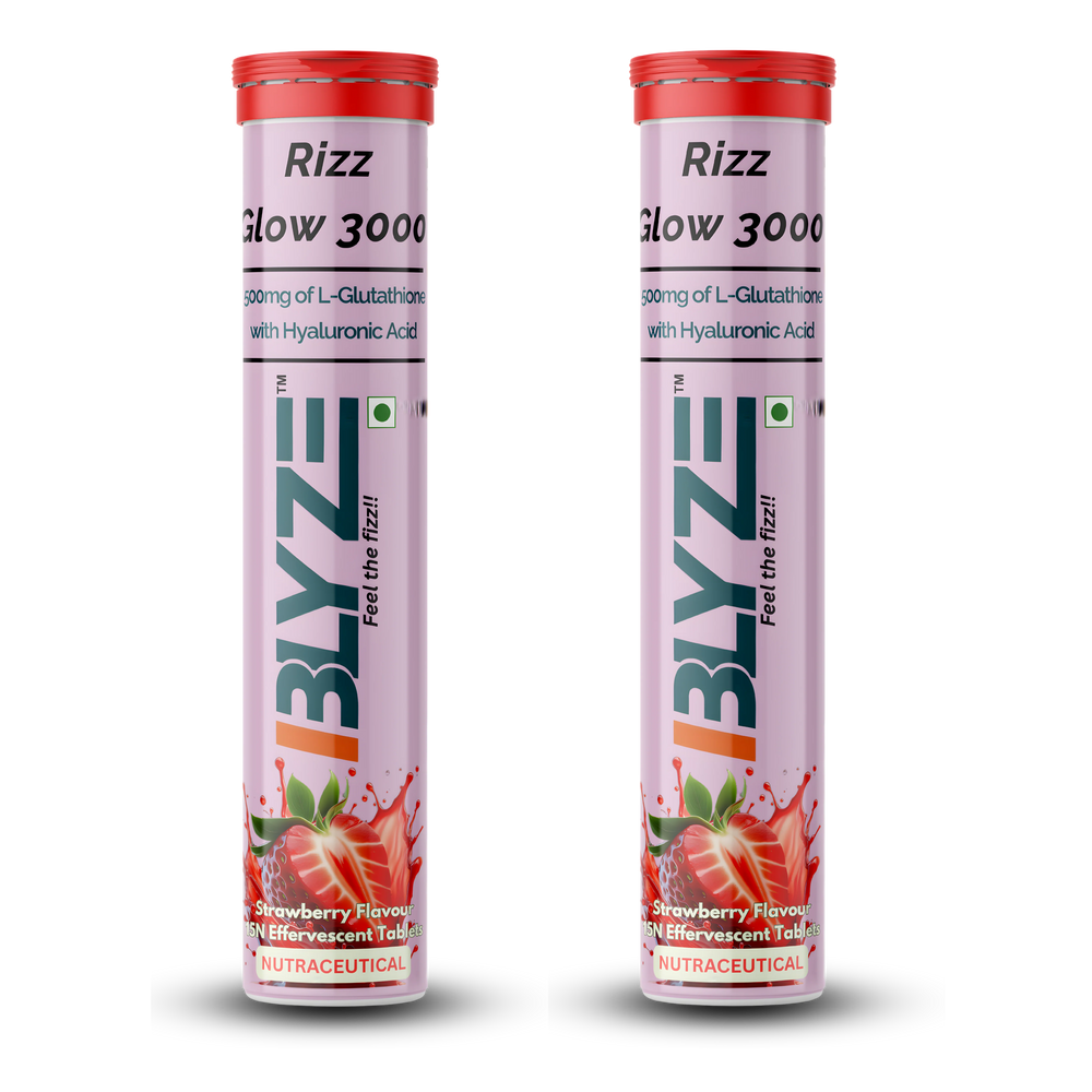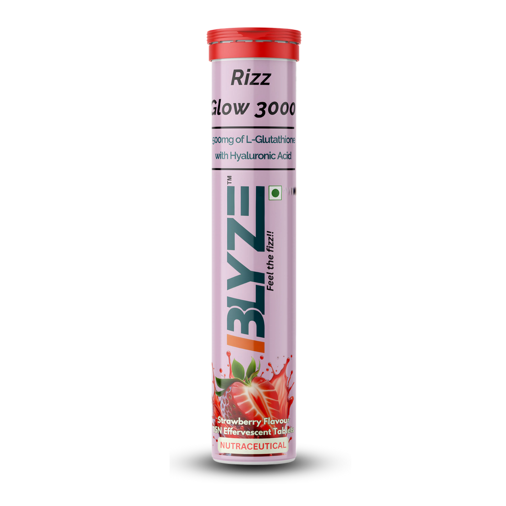 Looking for glutathione effervescent tablets in India? Rizz Glow 3000 is an advanced antioxidant skin support formula formulated with 500mg Reduced L-Glutathione, Hyaluronic Acid, Lycopene, Astaxanthin, and essential vitamins in a convenient effervescent format.
